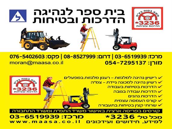 חברת משא בטוח מהגדולות והמובילות בארץ את תחום ההדרכות והבטיחות בתעבורה ובעבודה רישיון נהיגה למכונה ניידת מלגזה באישור משרד התחבורה רישיון מס 001 החברה פועלת בפריסה ארצית ומספקת שירותים באמצעות צוות ואנשי מקצוע בעלי רקע מקצועי וניסיון רב. שם איש קשר: מורן שוקר