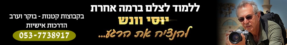 כולנו מצלמים את החוויות המרגשות שלנו, את האנשים שפגשנו, את המראות שראינו ואת האירועים שחווינו - אותם נרצה לזכור. אבל לא תמיד אנחנו מצליחים להעביר זאת בצילום. לעתים התמונות יוצאות מטושטשות, חשוכות או בהירות מידי, או שהן פשוט לא טובות ואנחנו לא תמיד יודעים להסביר למה. בקורס מעשי של 8 מפגשים תלמדו ותקבלו טיפים רבים להצליח בצילומים הבאים !!!! יוסי וונש 053-7738917 היחס האישי לכל משתתף והיקף החומר הנלמד, יוצרים קורס שכולו חוויית צילום ! אני מזמין אתכם להצטרף לקורס הצילום "להנציח את הרגע", ללמוד לצלם ברמה אחרת ולהתקדם באופן יעיל ומעשי! יוסי וונש 053-7738917 בנוסף, כתלמידי, תיהנו משורה של הנחות בחנויות צילום ופיתוח מהמובילות בארץ.
