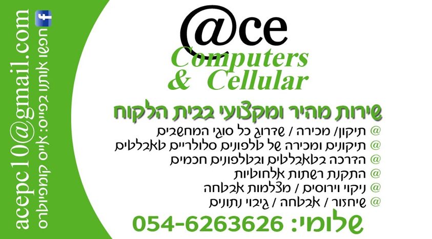אייס קומפיוטרס שרות מהיר ומקצועי בבית הלקוח . אמינות ומקצועיות מעל הכל !!!!! @תיקון , מכירה, שדרוג של כל סוגי המחשבים. @תיקון מכירה של טלפונים חכמים וטאבלטים @התקנת רשתות אלחוטיות. @ניקוי וירוסים, מצלמות אבטחה. @שיחזור, אבטחה, וגיבוי נתונים. השרות ניתן באזור השרון פ"ת וצפון ת"א