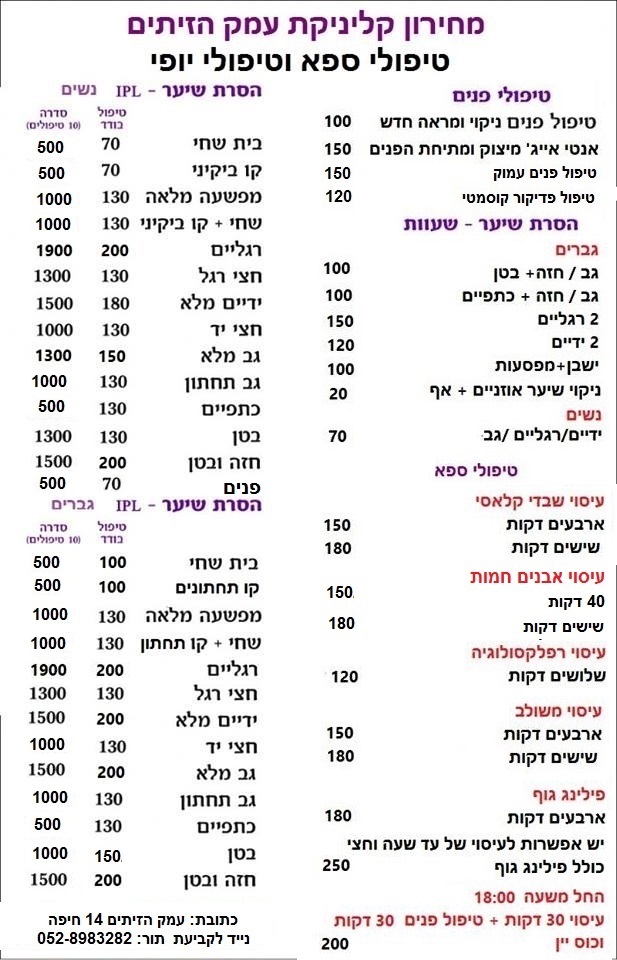 קליניקת עמק הזיתים. טיפולי ספא וטיפולי יופי. מגוון עיסויים ממעסה מקצועי ומוסמך: עיסוי שבדי קלאסי. רפלקסולוגיה, עיסוי משולב, עיסוי פילנג גוף. במקום ניתן למצוא גם שירות טיפולי יופי: טיפולי פנים למראה חדש נקי וצעיר. פדיקור, הסרת שיער בשעווה, הסרת שיער בלייזר. 10 אחוז הנחה לגולשי האתר veritiv