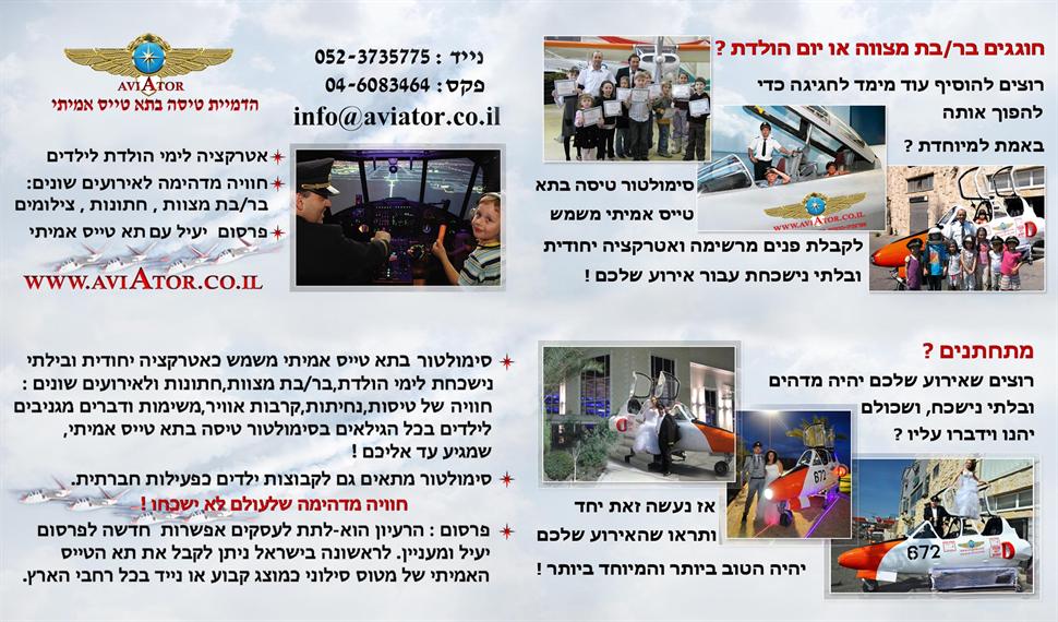 אטרקציה יחודית ובילתי נישכחת לימי הולדת לילדים.בר/בת מצוות.חתונות.ולאירועים שונים-חוויה של טיסות.נחיתות.קרבות אוויר.משימות ודברים מגניבים לילדים בכל הגילאים בסימולטור טיסה בתא טייס אמיתי.שמגיע עד אליכם.סימולטור מתאים גם לקבוצות ילדים כפעילות חברתית.!!!!!! פרסום יעיל לעסקים עם תא טייס אמיתי.לראשונה בישראל ניתן לקבל את תא הטייס אמיתי כמוצג קבוע או נייד בכל רחבי הארץ.