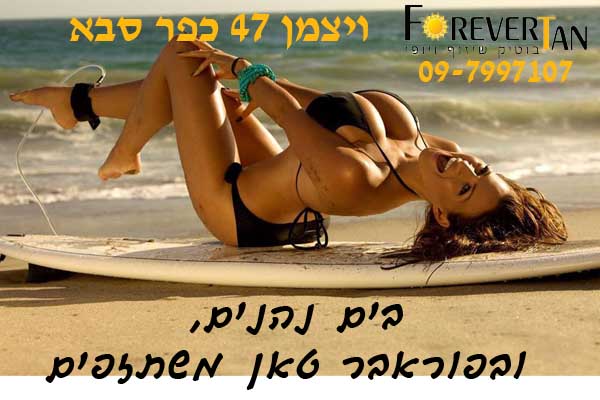 בבוטיק שלנו תמצאו מיטות שיזוף בעמידה (החזקות והאיכותיות בארץ) אשר יקנו לכם את חווית השיזוף האופטימאלית- שיזוף סולארי מהיר בכ-7 דקות בלבד. מיטת השיזוף שלנו מנוהלת ע"י תוכנת מחשב. התוכנה שולטת בפעולת מיטת השיזוף ובזמן פעולתה, ובכך מבטיחה זמן שיזוף קצוב שמבטיח שיזוף איכותי ומבוקר המותאם לכל אחד באופן אישי. במכון שיזוף Forever Tan מקפידים תמיד להיות עם היד על הדופק בכדי לשמור על הרמה, האיכות, החדשניות, והמקצועיות- שהם חלק בלתי נפרד מהחוויה, האווירה והשירות החם והאדיב אצלנו בבוטיק. והמחירים? על זה תדברו עם מאיה. צוות Forever Tan ישמח לעמוד לרשותכם בכל פניה ושאלה באמצעות הטלפון, באתר שלנו, ובעמוד הפייסבוק. אז כל שעליכם לעשות הוא לתאם איתנו תור, או פשוט להגיע אלינו לוייצמן 47 כפ"ס. מיקומינו הוא בפסאג' מאחורי פיצה האט. התקשרו עכשיו!!! 09-7997107